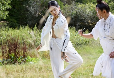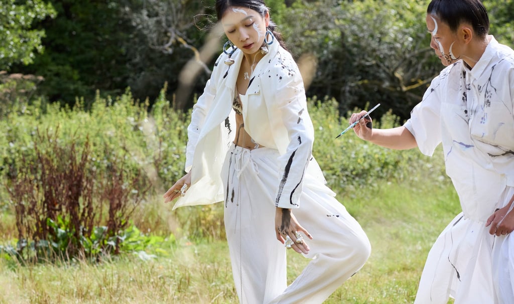I am an action artist; my work is rooted in Eastern philosophy and the Fluxus movement. It’s always about breaking boundaries and merging languages. Transformation is what matters. We had a very cinematic shoot on Box Hill this summer, the images feel like a faraway land, otherworldly, peaceful, almost timeless. Yet the laser element holds the narrative in a darker, more contained space. It becomes my live-painting ink, my response to the black box theatre. And Danni and Aolei, two extraordinary mixed-media artists, made this vision possible.