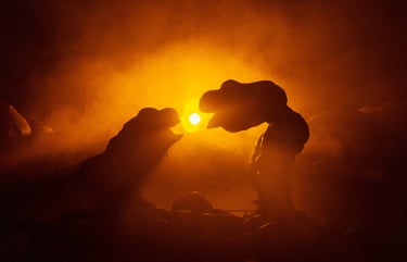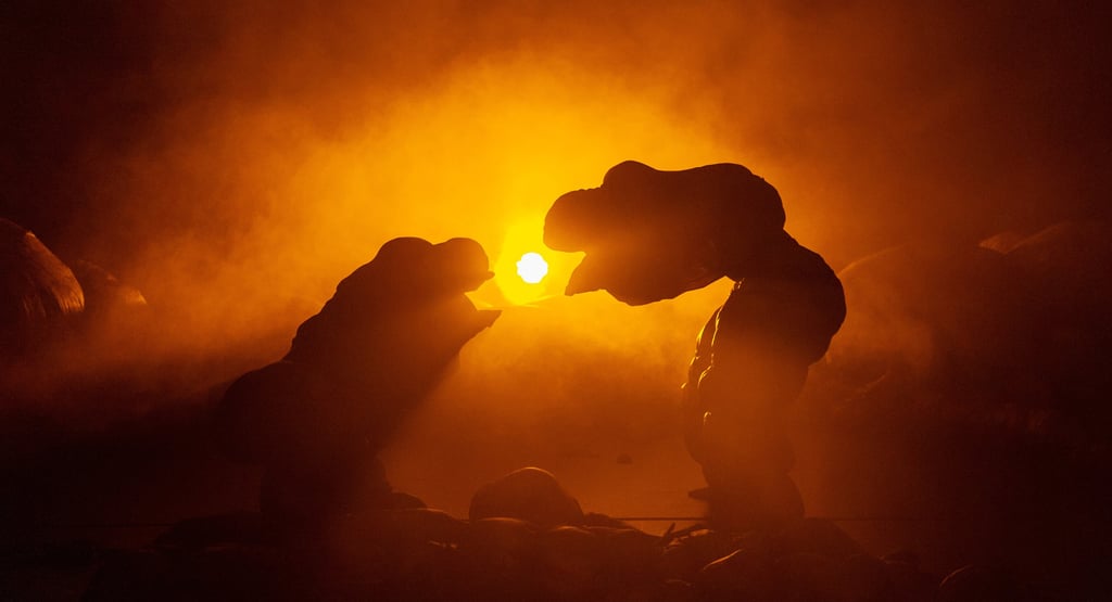 Soon, others follow, co-created and performed by Victoria Hunt and Eugene Choi, emerging as hybrid beings on four legs, part human and part animal. They transform into prehistoric spirits that stomp and howl as they devour smaller forms. A giant body swells until it fills the space. Limbs merge, separate and reassemble, as if evolution itself is happening before our eyes. The scene then transforms into a vast mushroom world, where everything feels oversized and slightly unreal. Giant fungi seem to breathe, swaying gently, glowing under the light. A witch-like figure emerges, masked and tall, both commanding and strangely delicate.