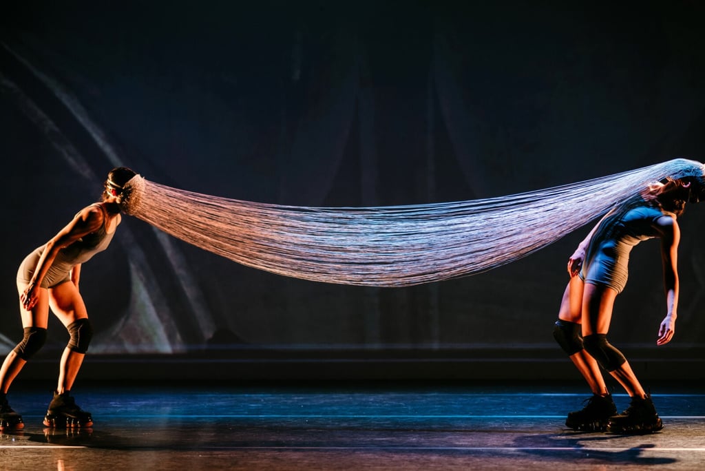 Costume design by Mikio Sakabe and Ana Rajčević intensifies the sense of estrangement. Futuristic shoes, tight jumpsuits and sculptural objects, including a mask physically linking two performers and oversized bone-like forms, distort familiar outlines. The stage world becomes uncanny, echoing the film’s bleak, dystopian atmosphere.
