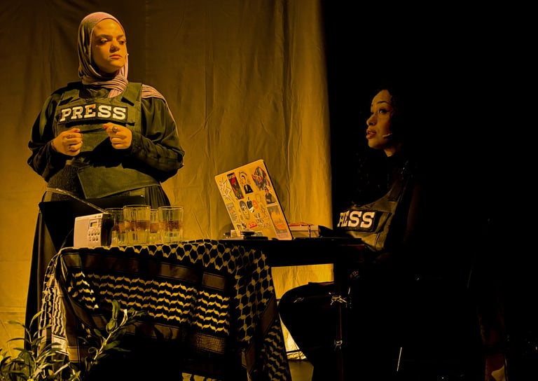 At the centre are two intertwining lives: Sondos, a law student, and Bashar, a human rights lawyer, performed by Christin El-Kholy and Laila Hashem. Their diary-like narratives unfold across multiple wars, mapping love and resistance through loss. Mariam Shak’a’s live oud performance weaves against this background, a sonic act of defiance. Her voice folds traditional Palestinian songs into the air, grounding the room in tenderness and endurance.