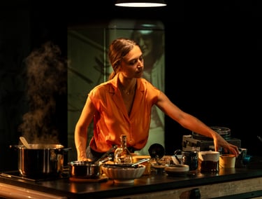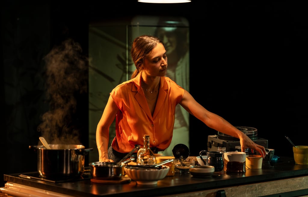 Marty Langthorne’s lighting design allows these shifts between past and present to flicker and blur. Shadows fall across the stage like memories. A light dims, and we’re suddenly in a flashback. Then it returns, and we’re back in the here and now. The character reminds herself urgently yet gently, “Focus. Today is the day. And the food, it’s going to be good.” Sound designer Dan Balfour complements this rhythm with a score that breathes in and out of the action: silence, noise, the clatter of pans, a door slamming, the hiss of oil in a hot pan. The audience is drawn into the fragmentation of memory, but also into the ritual of making something new.
