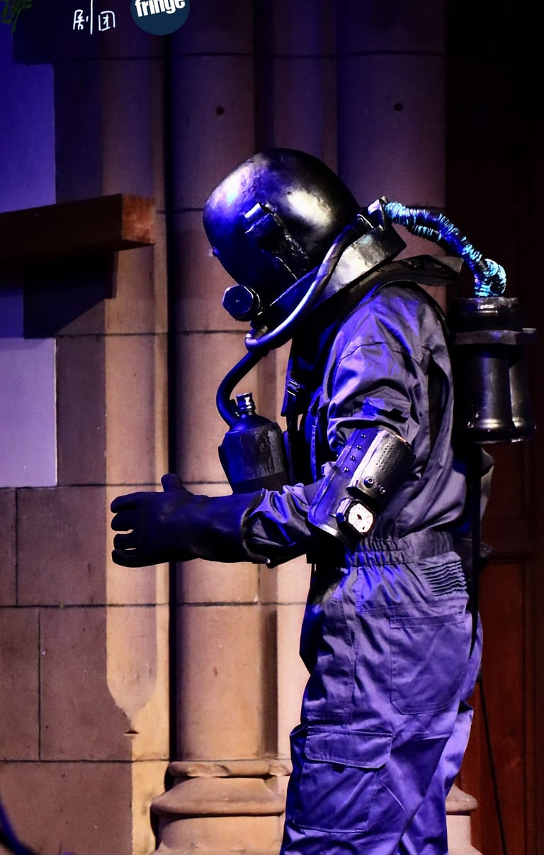 Yuhao Yin shifts seamlessly between physical storytelling modes, offering a performance that is both grounded and visceral. Particularly striking are the moments after the performer dons the diving suit, where movement slows and weight becomes pronounced. His ability to evoke underwater resistance, through dragging steps, sudden collapses, and high-intensity bursts of physicality, brings a raw intensity to the diver’s struggle. The repeated slamming of the body to the floor, in particular, becomes a kind of rhythm that underlines the psychological and physical toll of survival.