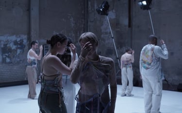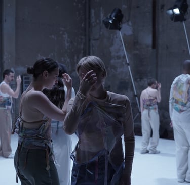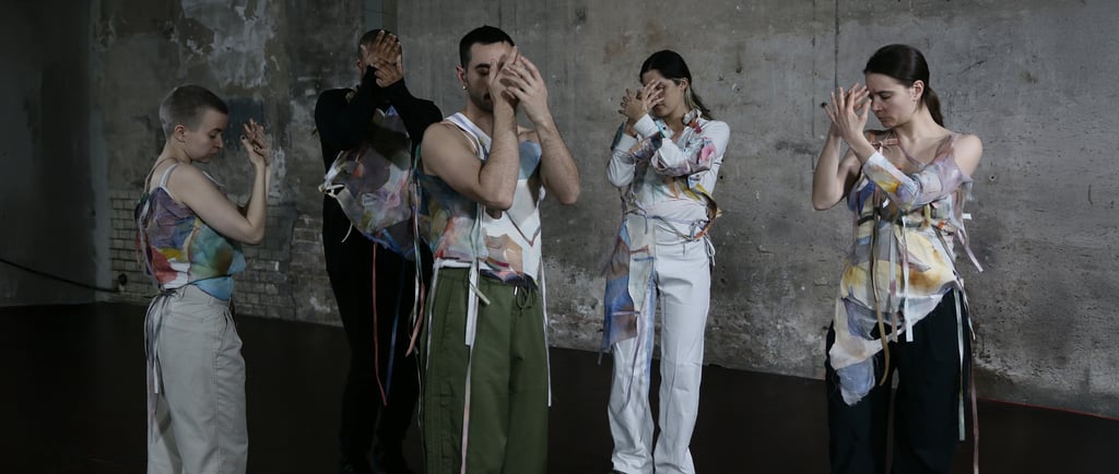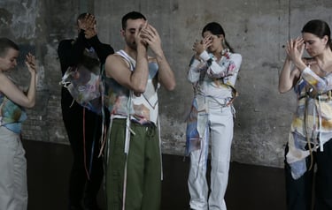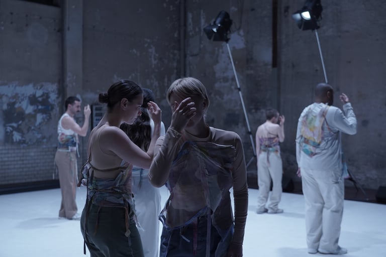 The costumes consist of layered, collage-like pieces in pale tones, arranged on the upper body and made of fabrics resembling silk. The score relies on repeating musical phrases with slight variations. These alterations work in step with the dancers’ controlled changes in timing and direction. Lighting supports the work by moving between shadow and brightness without drawing the eye away from the performers.