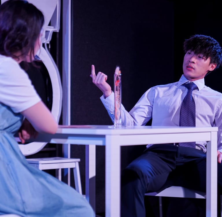 This sitcom-like tone continues throughout. Whether in the scene with the plumber or the arranged date with Woman’s future husband (both roles played by Yi Hsin Wang), his performances vividly portray two patronizing men who excel at mansplaining while disregarding women’s thoughts and feelings. The chemistry between Yi Hsin Wang and Marian Lee brings playful tension to the stage. Their dynamic not only highlights the arrogance of male authority figures and the systemic silencing of women in patriarchal structures but also injects levity that prevents the production from becoming overwhelmingly heavy.