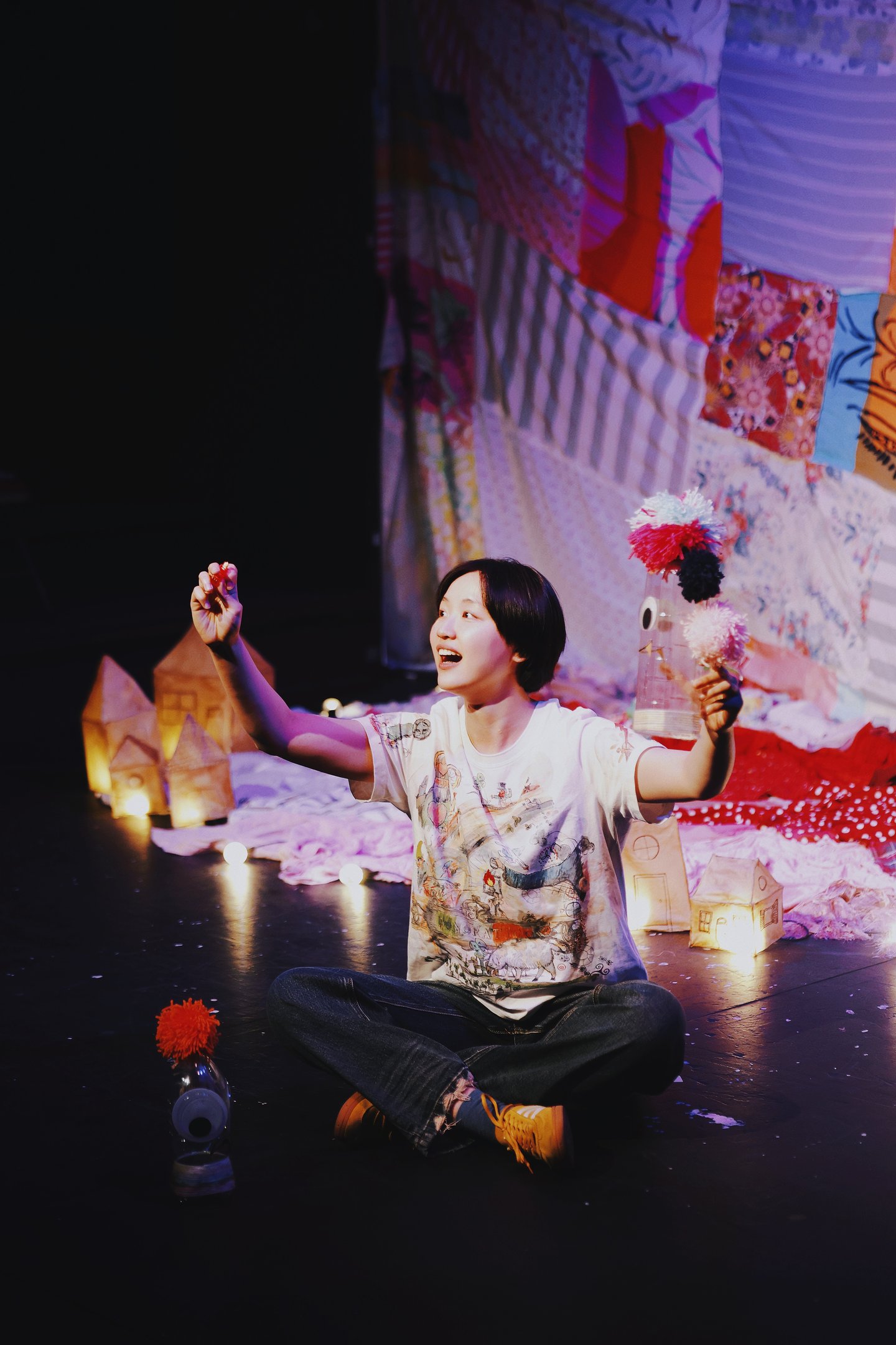 The stage (designed by Zidi Wu) is dressed in warm-toned fabric strips stitched across the space like memory itself, dotted with tiny lights that evoke the quiet intimacy of home. Delicate music-box melodies and the occasional ring of a distant bell anchor the dreamscape during transitions, by Sound Designer Belle Bao, grounding it in lived experience.