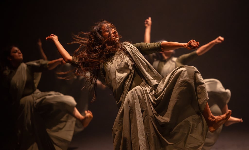 Structured in three parts, Thikra unfolds through states of awakening, trance, and release. The choreography blends Akram Khan’s distinctive movement language, with a grounded, low centre of gravity, arms lifted high and hands tracing expressive, symbolic gestures, intricate footwork, and the use of hair as both a tether and an instrument, together with contributions from dancers trained in Bharatanatyam and contemporary dance. The ensemble of thirteen moves with both precision and emotional intensity. Anger, pain, and power surge through the collective rhythm, evoking the raw energy of the desert. The movement is meticulously crafted yet emotionally visceral, full of strength, yearning, and ritual significance. Female figures appear as warriors, vessels, and spirits, carrying memory and ceremony in their bodies.